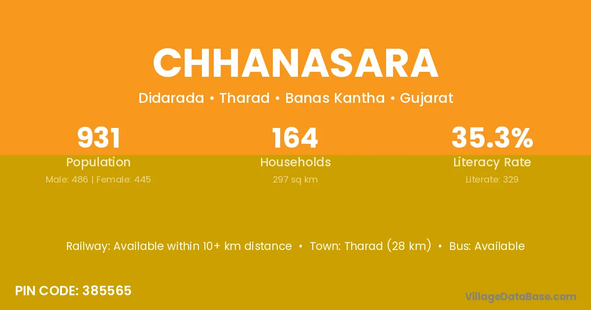 Tharad (28 km) is the nearest town to Chhanasara village for major economic activities and is located approximately 28 km away.