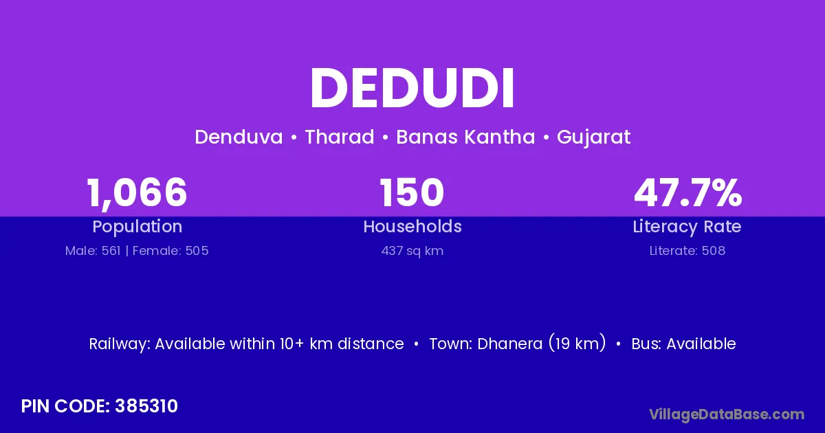 Dhanera (19 km) is the nearest town to Dedudi village for major economic activities and is located approximately 19 km away.