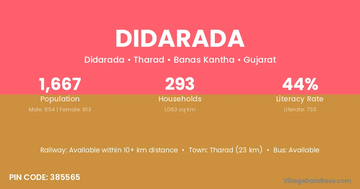 Tharad (23 km) is the nearest town to Didarada village for major economic activities and is located approximately 23 km away.