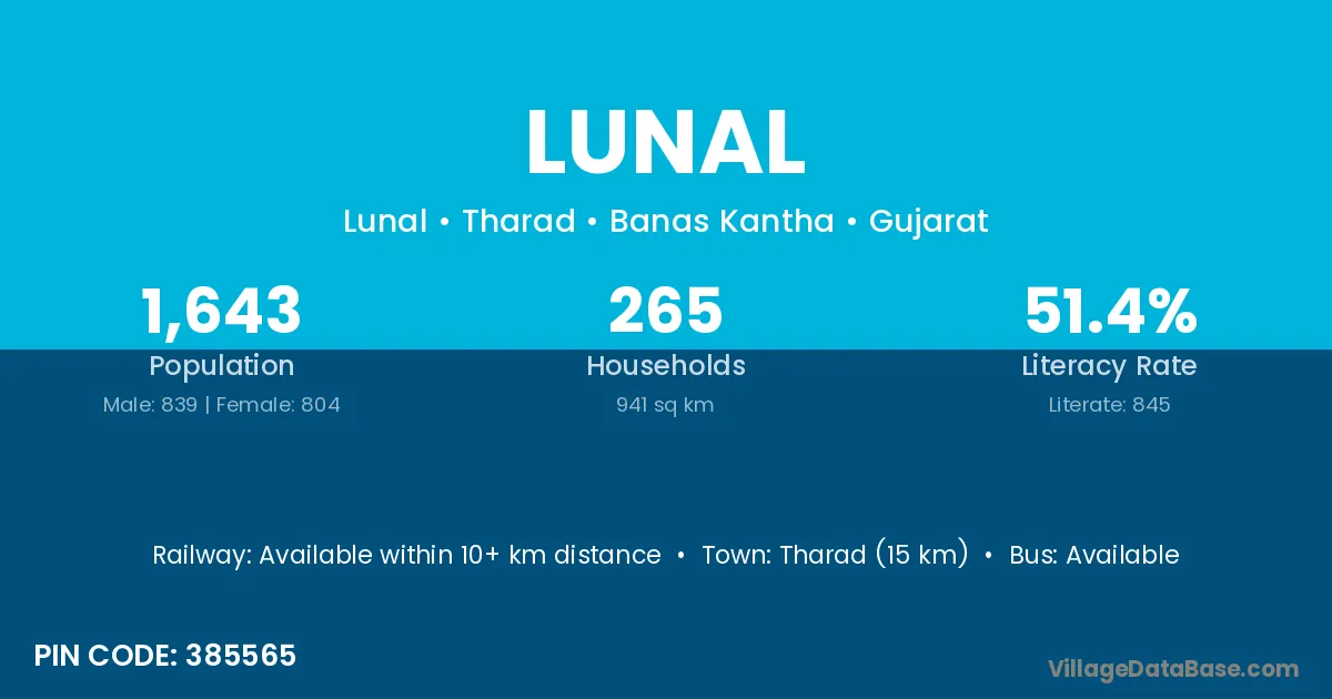Tharad (15 km) is the nearest town to Lunal village for major economic activities and is located approximately 15 km away.