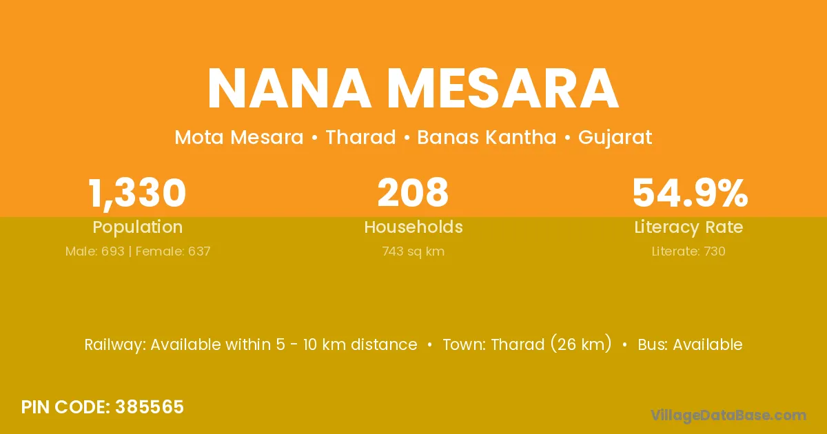 Tharad (26 km) is the nearest town to Nana Mesara village for major economic activities and is located approximately 26 km away.