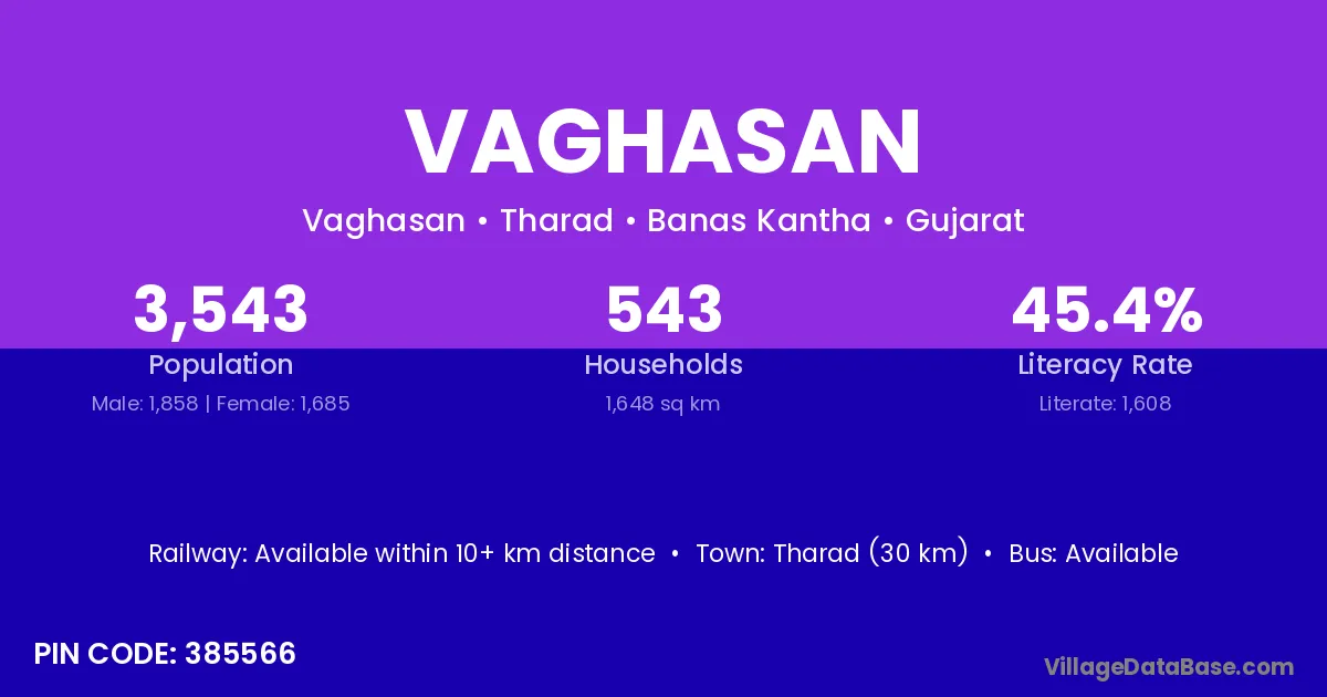 Tharad (30 km) is the nearest town to Vaghasan village for major economic activities and is located approximately 30 km away.