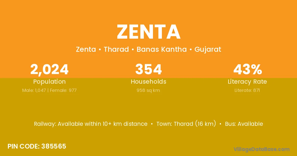 Tharad (16 km) is the nearest town to Zenta village for major economic activities and is located approximately 16 km away.