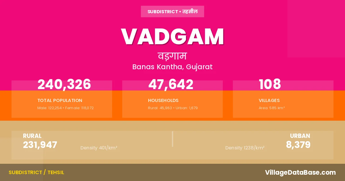 According to the 2011 census The total area of Vadgam Taluka is 585 km², with a population of 240326 people. The population density is 411 inhabitants per square kilometre, and there are approximately 47642 houses in the sub district.