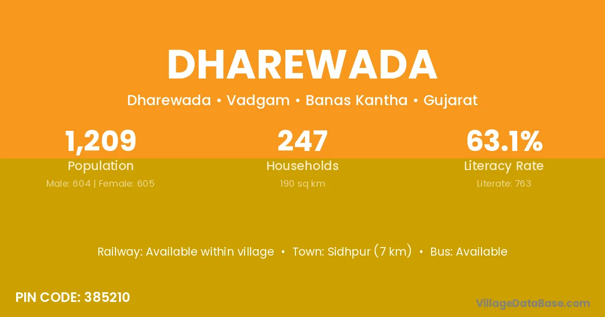 Sidhpur (7 km) is the nearest town to Dharewada village for major economic activities and is located approximately 7 km away.