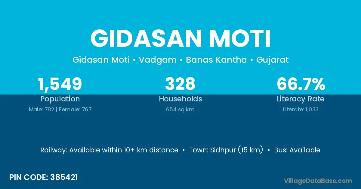 Sidhpur (15 km) is the nearest town to Gidasan Moti village for major economic activities and is located approximately 15 km away.