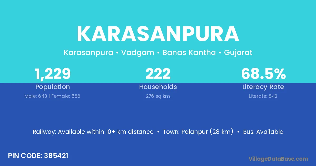 Palanpur (28 km) is the nearest town to Karasanpura village for major economic activities and is located approximately 28 km away.