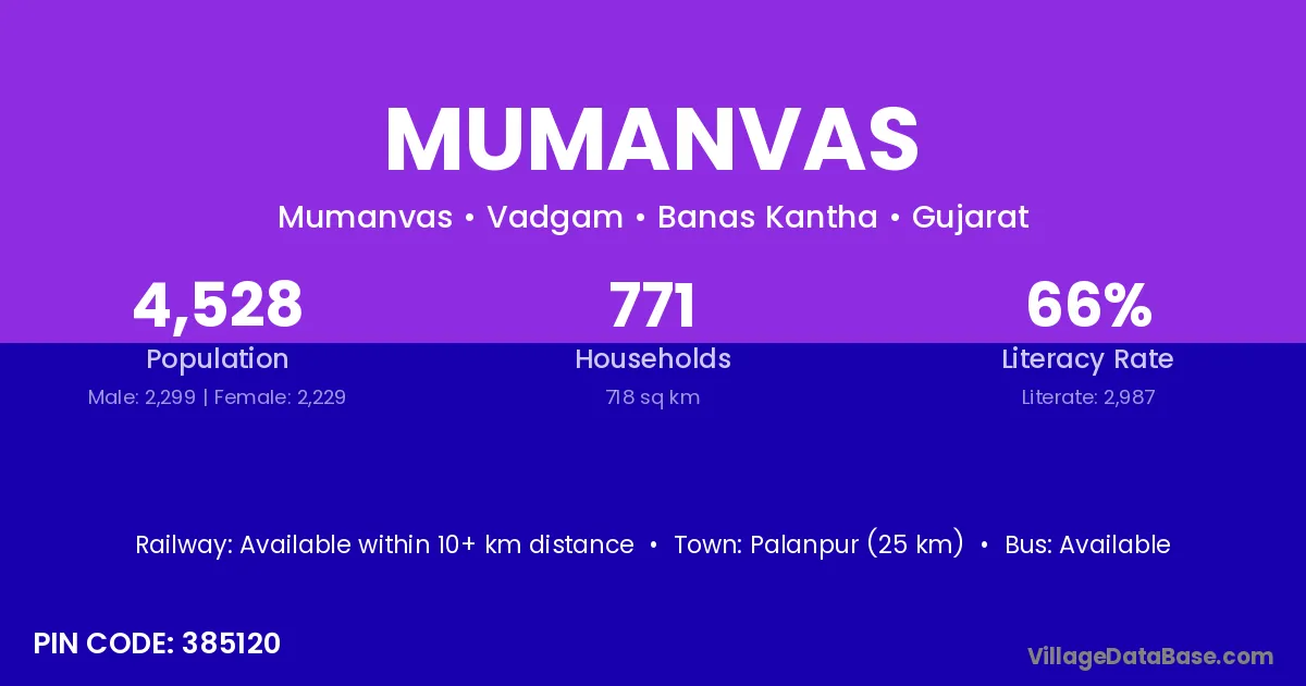 Palanpur (25 km) is the nearest town to Mumanvas village for major economic activities and is located approximately 25 km away.
