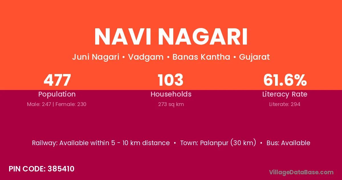 Palanpur (30 km) is the nearest town to Navi Nagari village for major economic activities and is located approximately 30 km away.