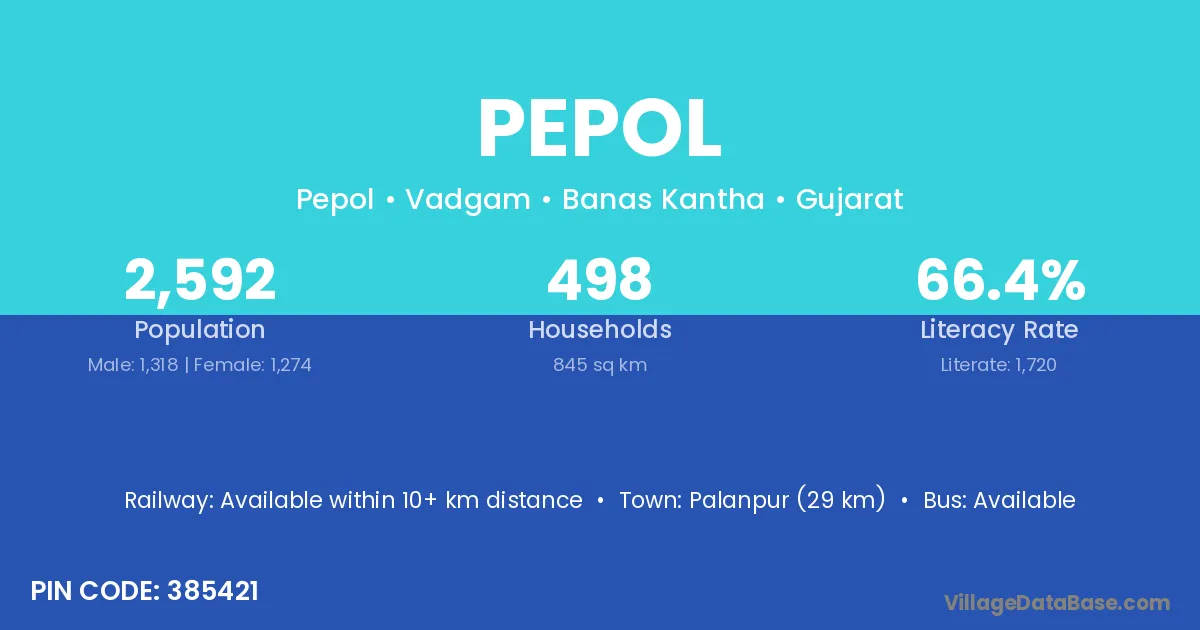 Palanpur (29 km) is the nearest town to Pepol village for major economic activities and is located approximately 29 km away.