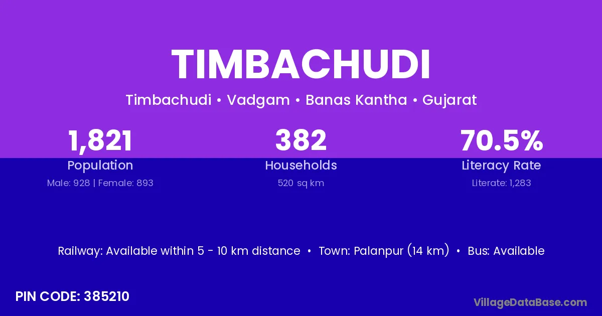 Palanpur (14 km) is the nearest town to Timbachudi village for major economic activities and is located approximately 14 km away.