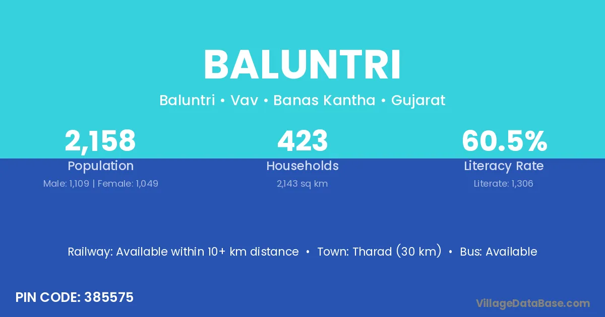 Tharad (30 km) is the nearest town to Baluntri village for major economic activities and is located approximately 30 km away.