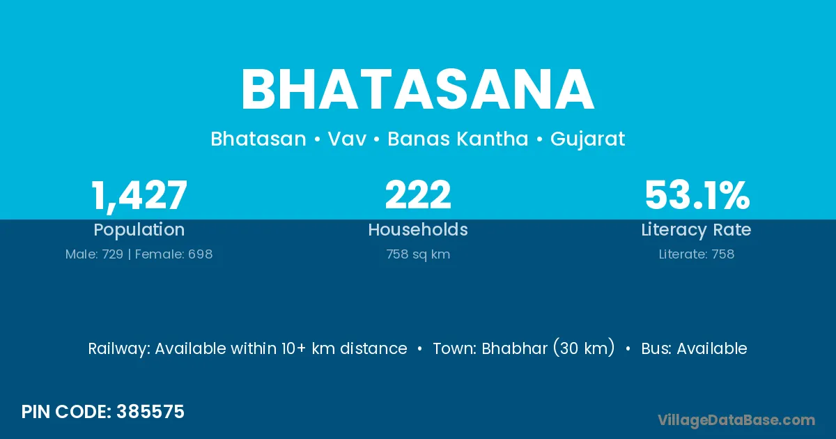 Bhabhar (30 km) is the nearest town to Bhatasana village for major economic activities and is located approximately 30 km away.