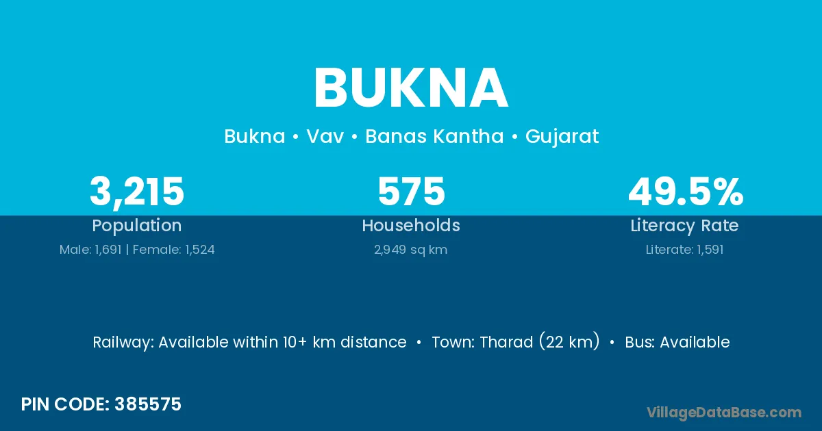 Tharad (22 km) is the nearest town to Bukna village for major economic activities and is located approximately 22 km away.