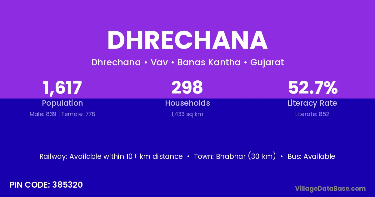 Bhabhar (30 km) is the nearest town to Dhrechana village for major economic activities and is located approximately 30 km away.