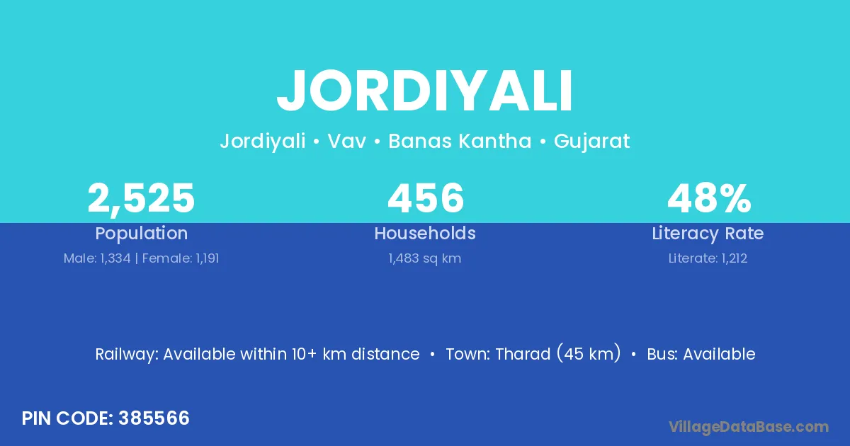 Tharad (45 km) is the nearest town to Jordiyali village for major economic activities and is located approximately 45 km away.