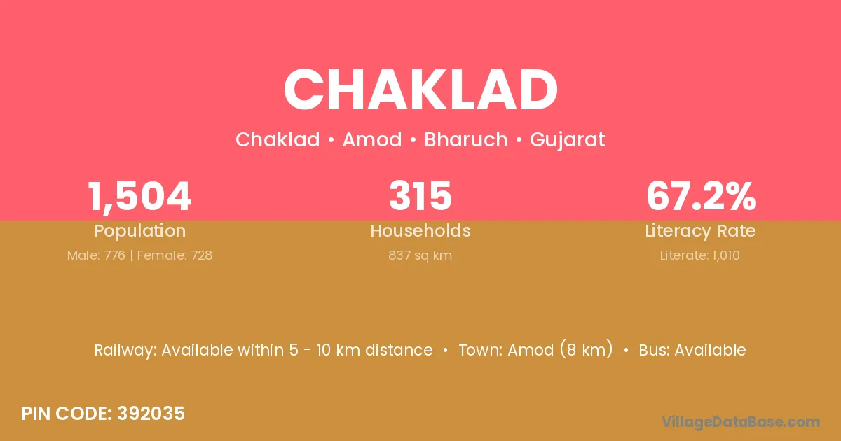Amod (8 km) is the nearest town to Chaklad village for major economic activities and is located approximately 8 km away.