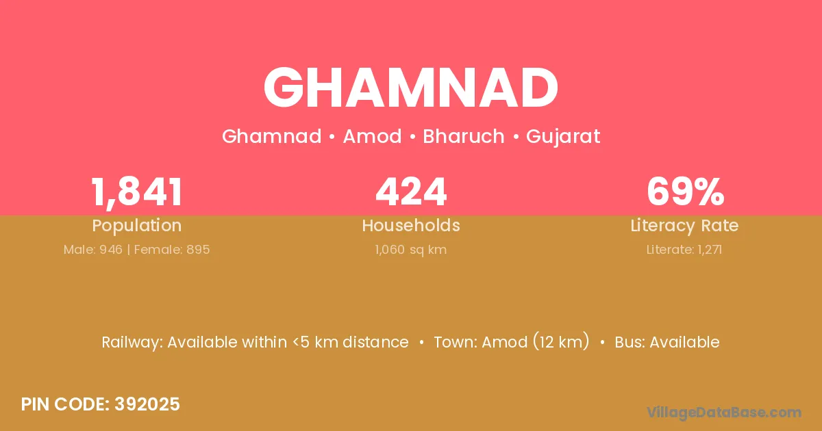 Amod (12 km) is the nearest town to Ghamnad village for major economic activities and is located approximately 12 km away.