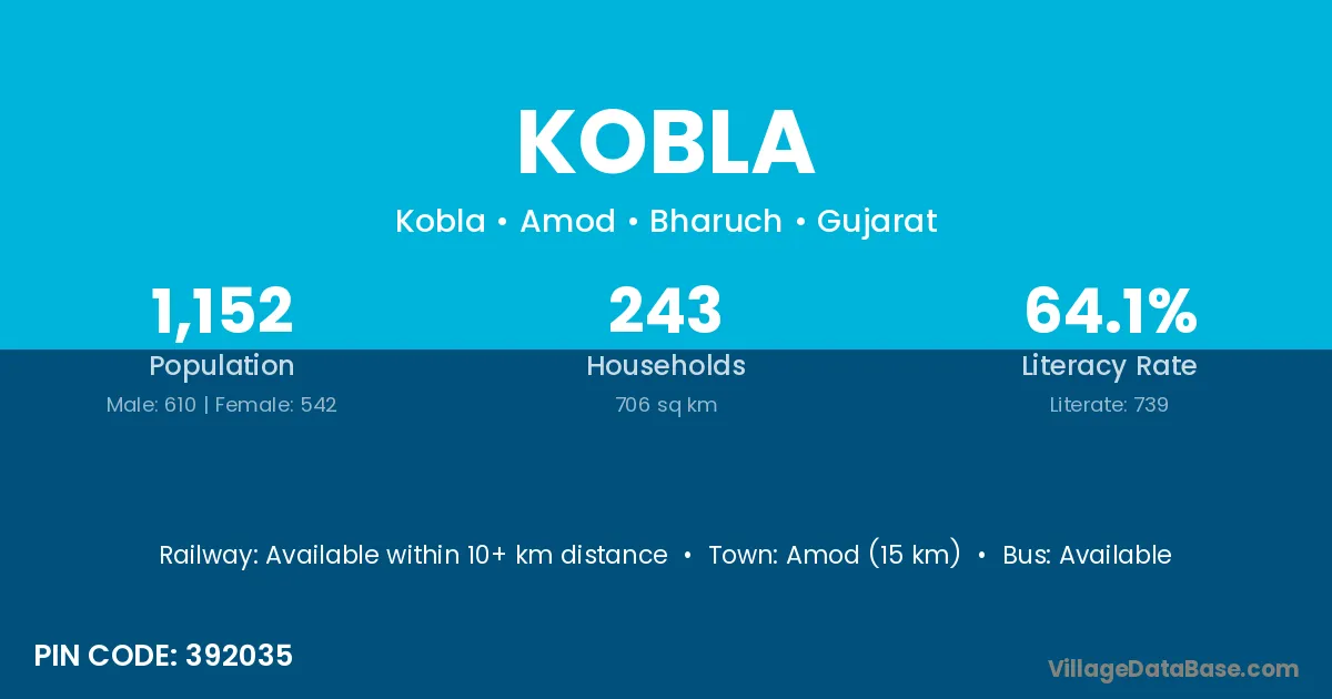 Amod (15 km) is the nearest town to Kobla village for major economic activities and is located approximately 15 km away.