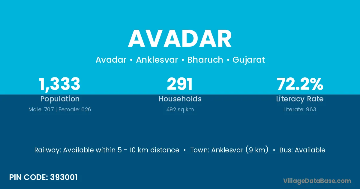 Anklesvar (9 km) is the nearest town to Avadar village for major economic activities and is located approximately 9 km away.
