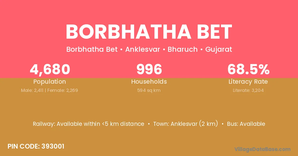 Anklesvar (2 km) is the nearest town to Borbhatha Bet village for major economic activities and is located approximately 2 km away.