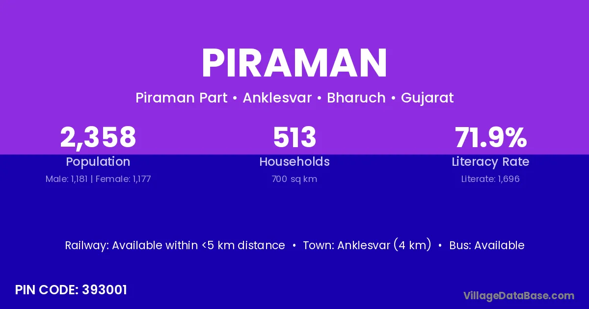 Anklesvar (4 km) is the nearest town to Piraman village for major economic activities and is located approximately 4 km away.