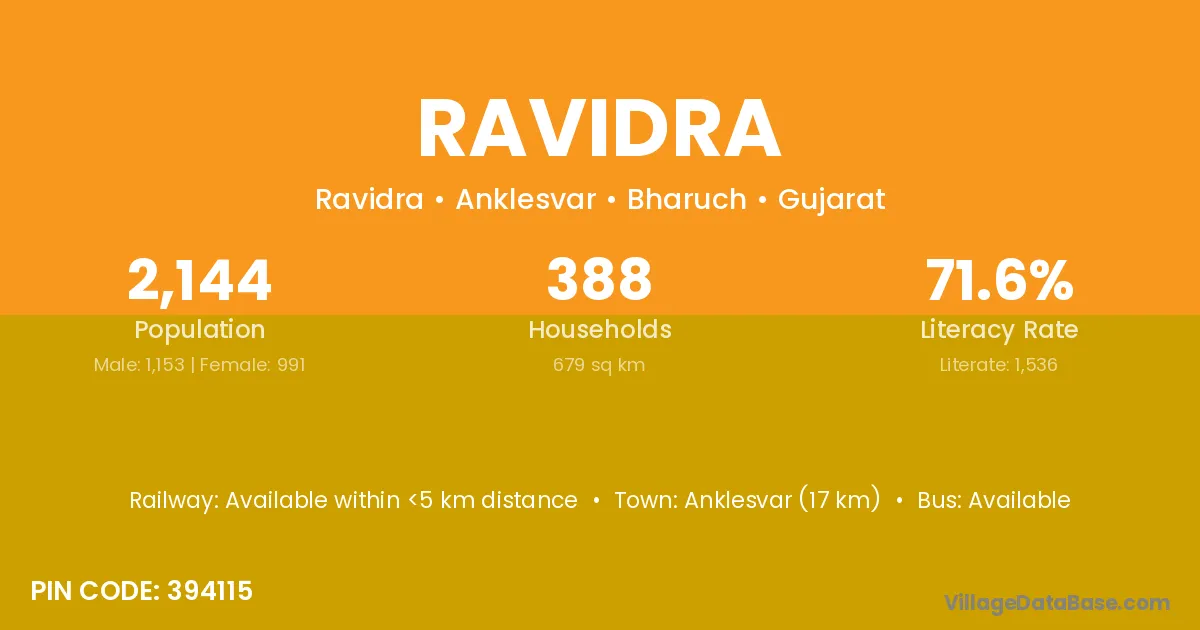 Anklesvar (17 km) is the nearest town to Ravidra village for major economic activities and is located approximately 17 km away.