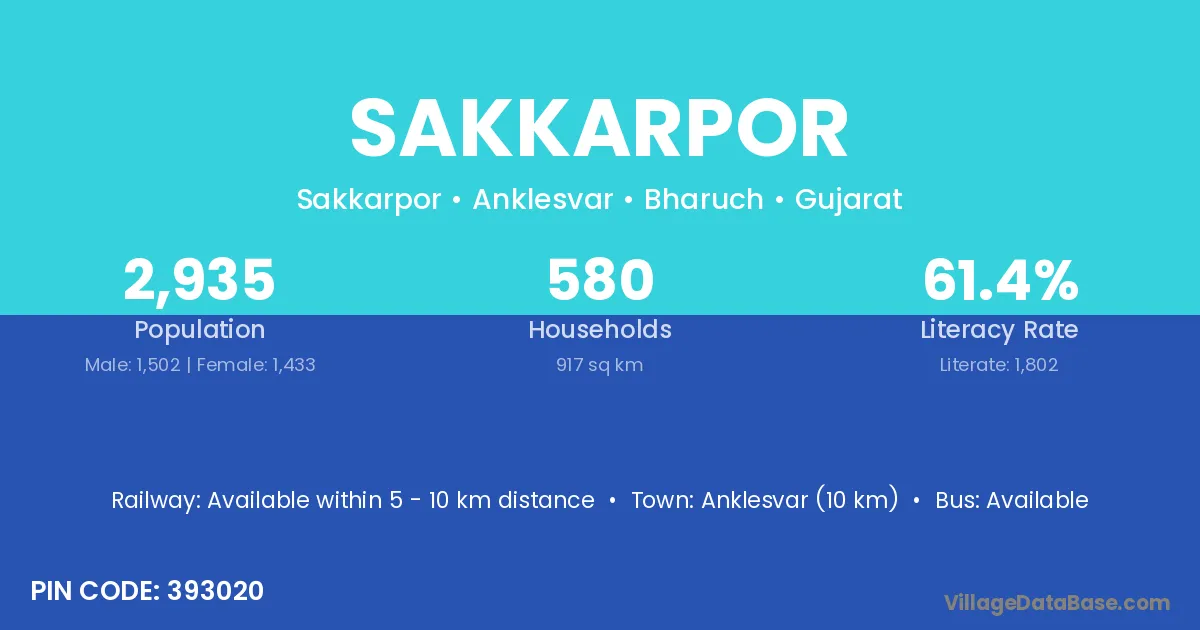 Anklesvar (10 km) is the nearest town to Sakkarpor village for major economic activities and is located approximately 10 km away.