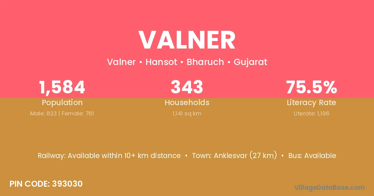Anklesvar (27 km) is the nearest town to Valner village for major economic activities and is located approximately 27 km away.