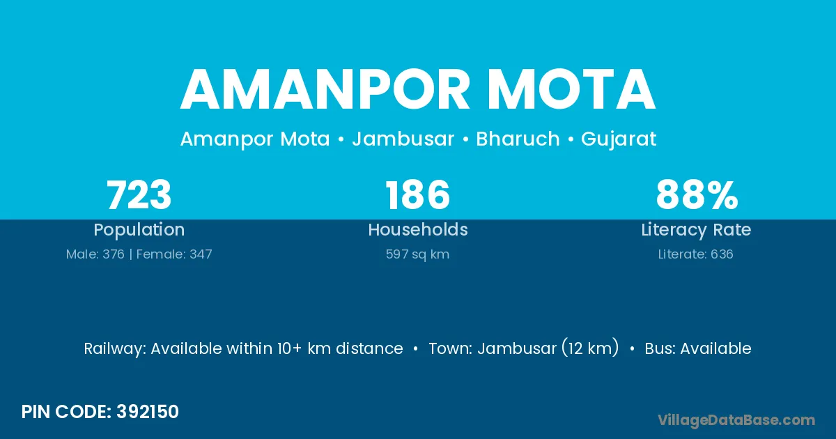 Jambusar (12 km) is the nearest town to Amanpor Mota village for major economic activities and is located approximately 12 km away.