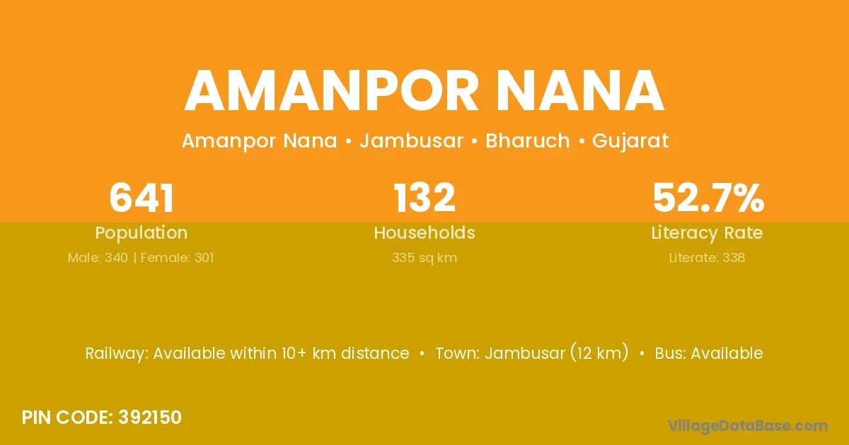 Jambusar (12 km) is the nearest town to Amanpor Nana village for major economic activities and is located approximately 12 km away.
