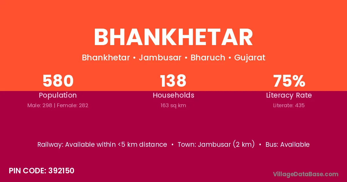 Jambusar (2 km) is the nearest town to Bhankhetar village for major economic activities and is located approximately 2 km away.