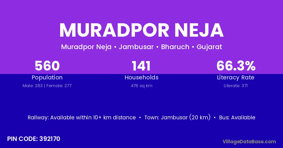 Jambusar (20 km) is the nearest town to Muradpor Neja village for major economic activities and is located approximately 20 km away.