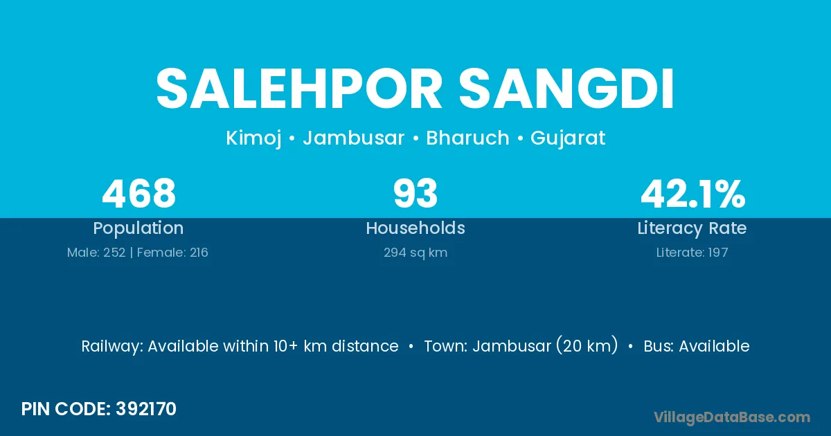 Jambusar (20 km) is the nearest town to Salehpor Sangdi village for major economic activities and is located approximately 20 km away.