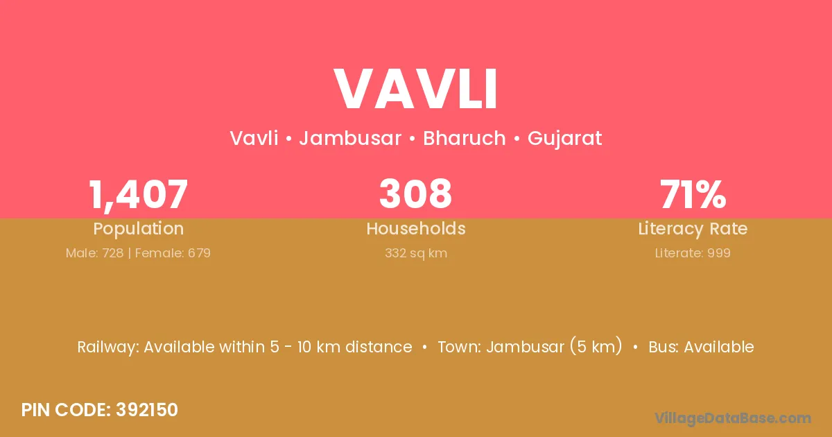 Jambusar (5 km) is the nearest town to Vavli village for major economic activities and is located approximately 5 km away.