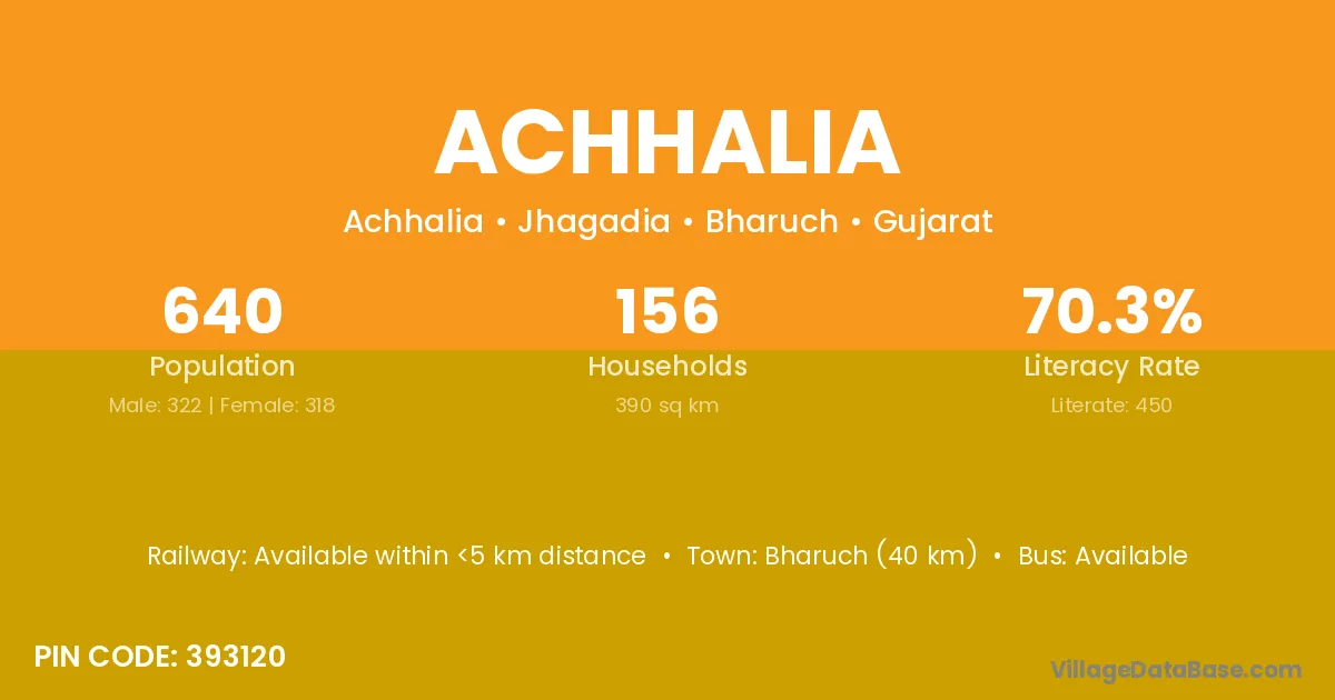 Bharuch (40 km) is the nearest town to Achhalia village for major economic activities and is located approximately 40 km away.