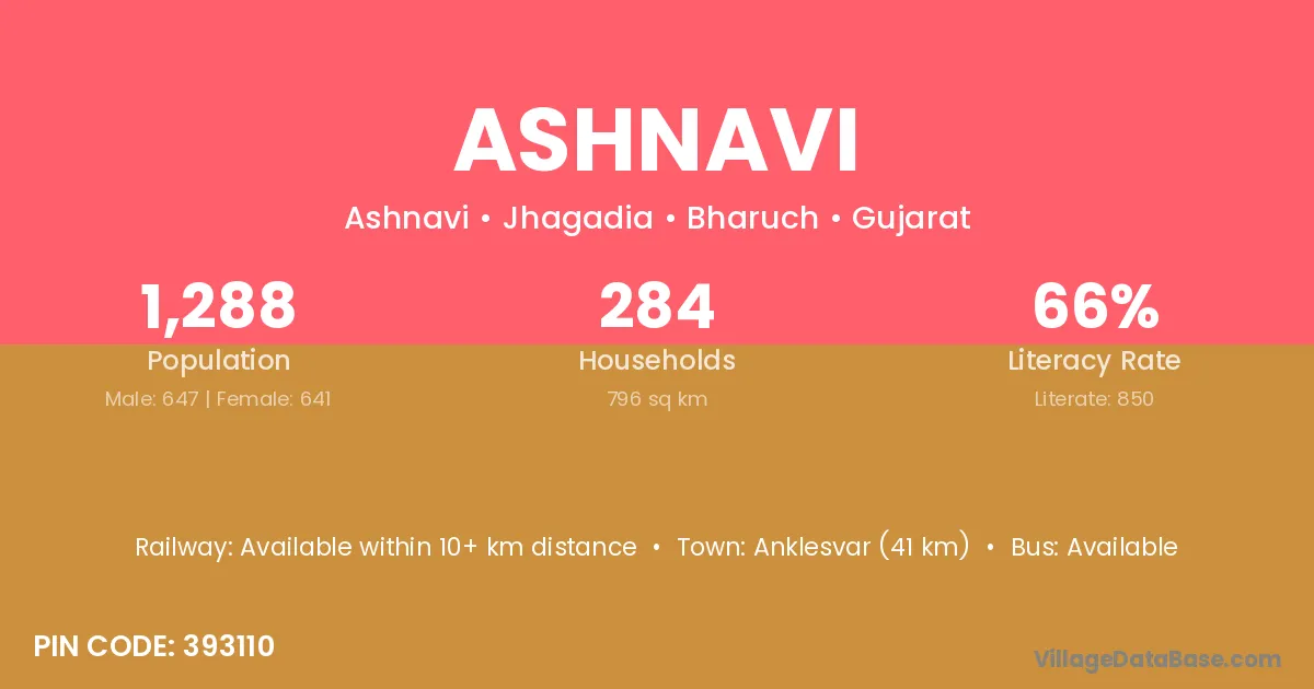 Anklesvar (41 km) is the nearest town to Ashnavi village for major economic activities and is located approximately 41 km away.