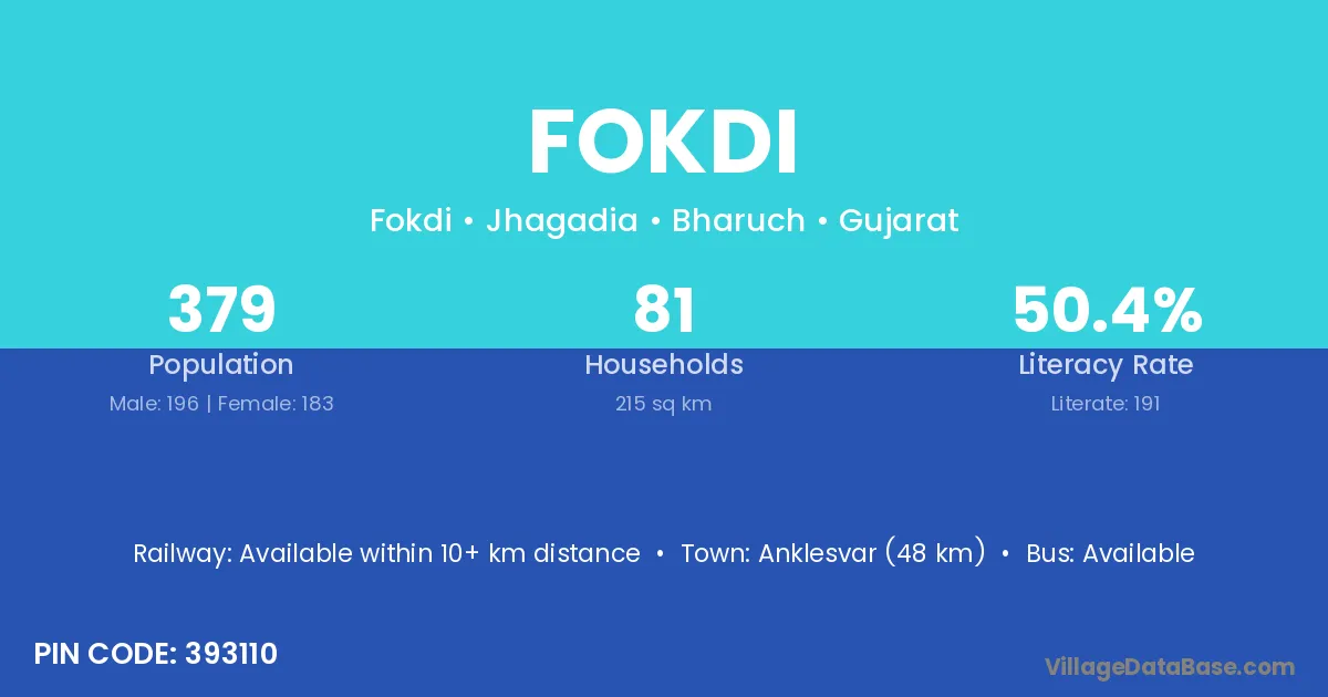 Anklesvar (48 km) is the nearest town to Fokdi village for major economic activities and is located approximately 48 km away.