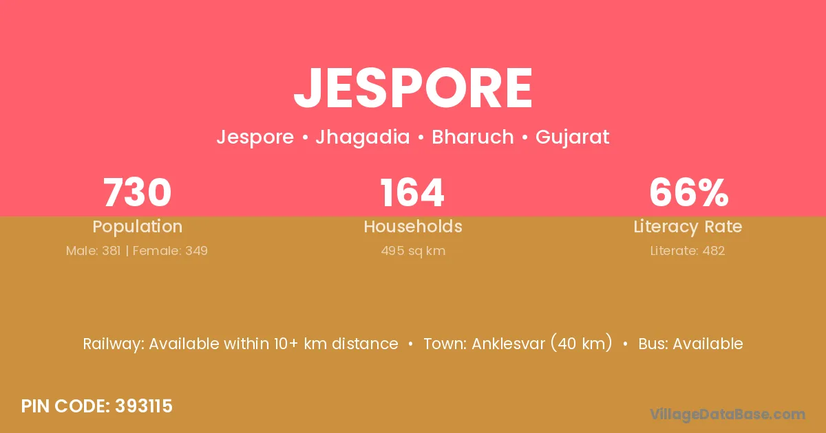 Anklesvar (40 km) is the nearest town to Jespore village for major economic activities and is located approximately 40 km away.