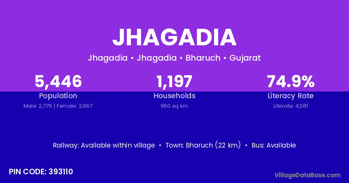 Bharuch (22 km) is the nearest town to Jhagadia village for major economic activities and is located approximately 22 km away.