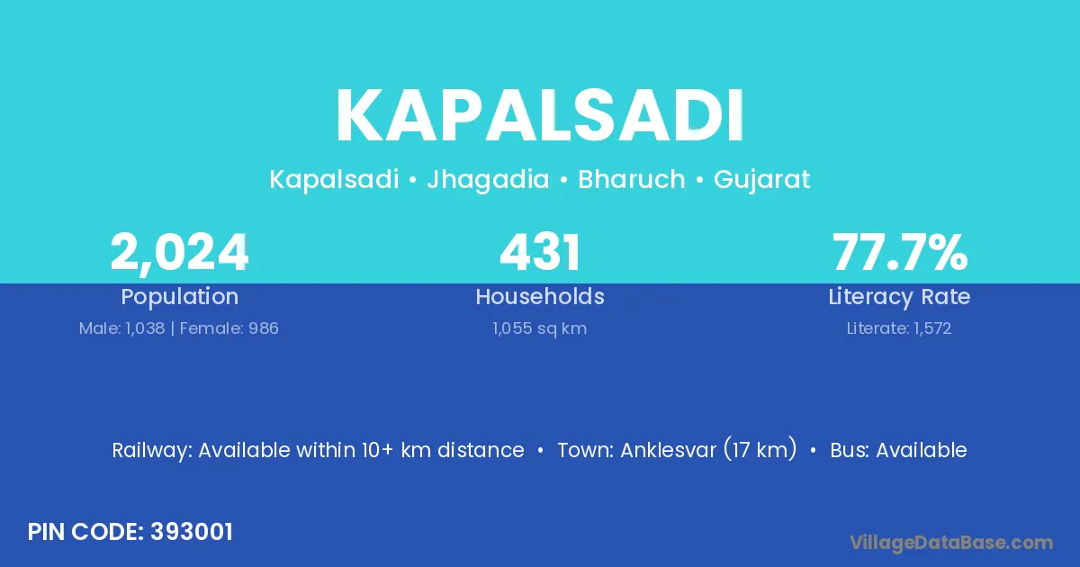 Anklesvar (17 km) is the nearest town to Kapalsadi village for major economic activities and is located approximately 17 km away.