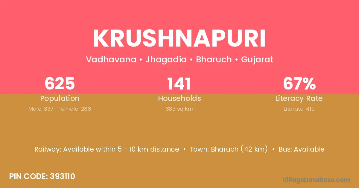 Bharuch (42 km) is the nearest town to Krushnapuri village for major economic activities and is located approximately 42 km away.