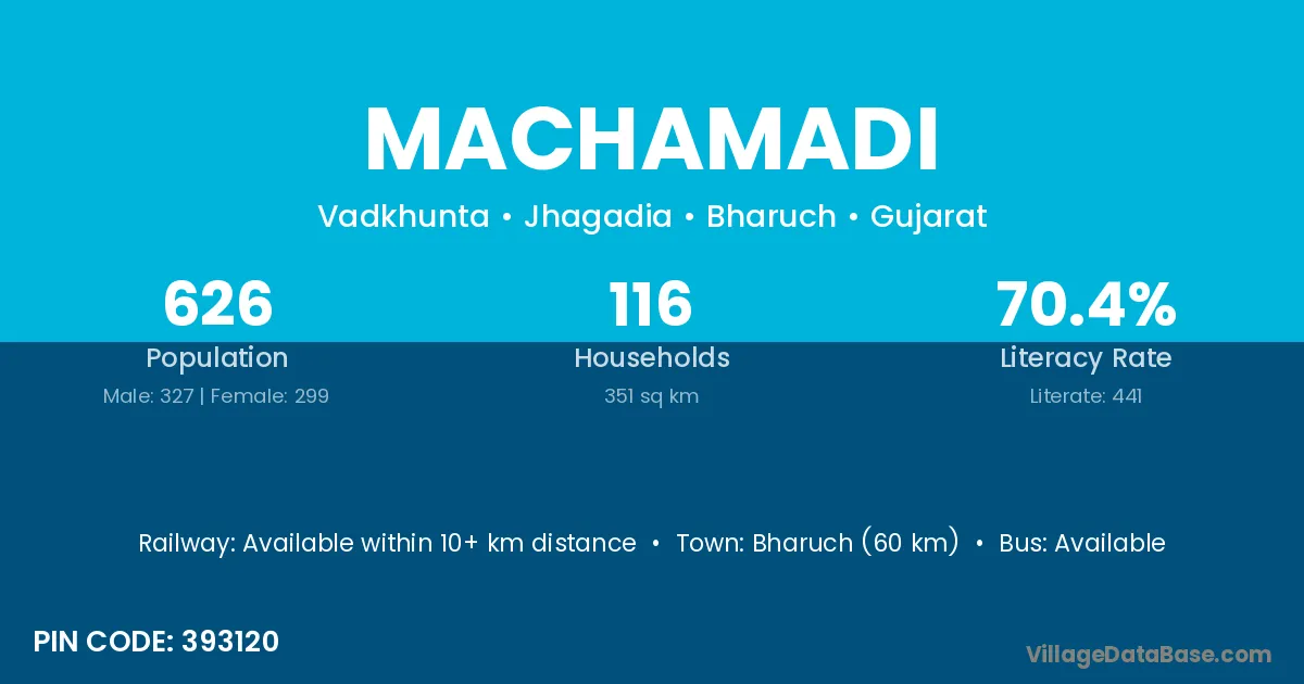 Bharuch (60 km) is the nearest town to Machamadi village for major economic activities and is located approximately 60 km away.