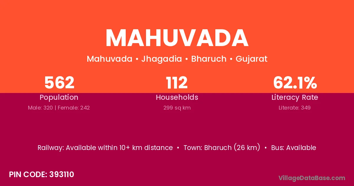 Bharuch (26 km) is the nearest town to Mahuvada village for major economic activities and is located approximately 26 km away.