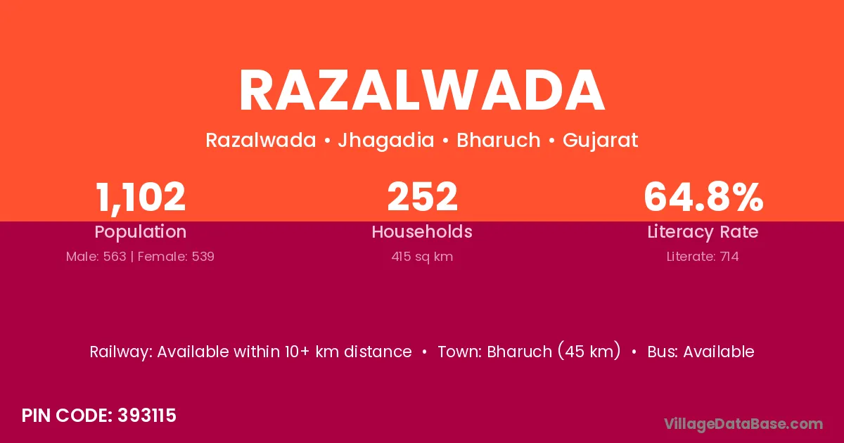 Bharuch (45 km) is the nearest town to Razalwada village for major economic activities and is located approximately 45 km away.