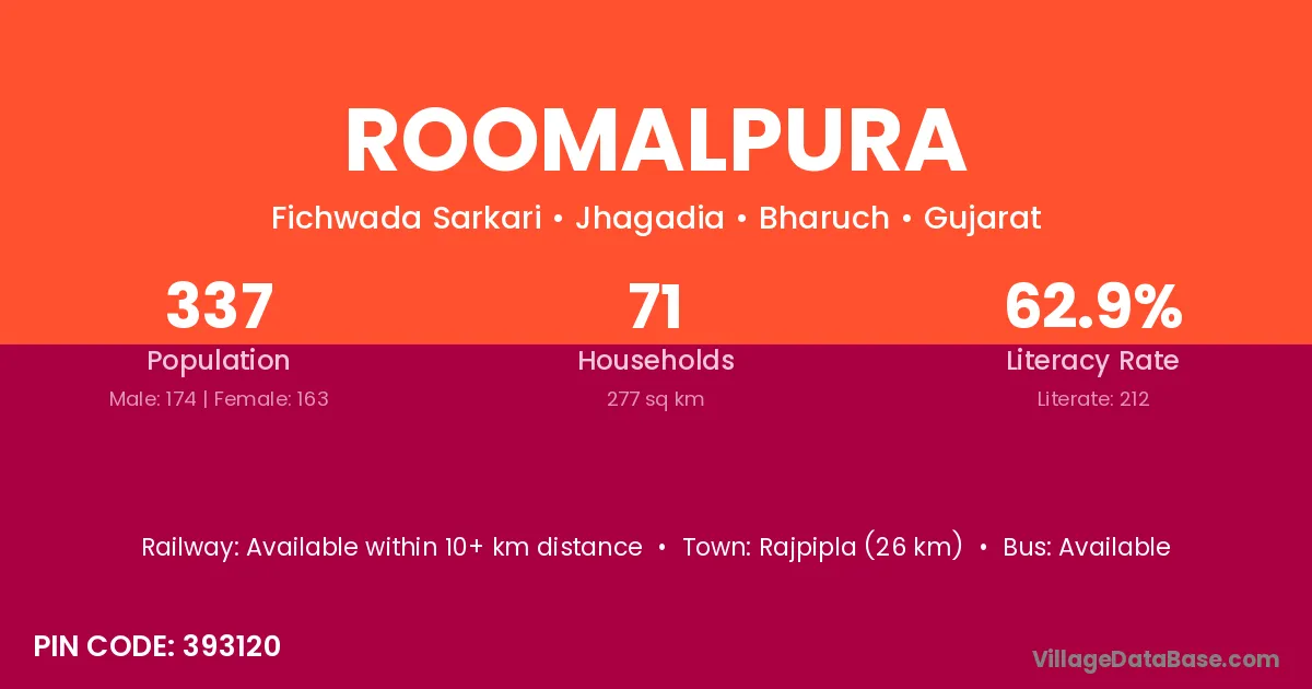 Rajpipla (26 km) is the nearest town to Roomalpura village for major economic activities and is located approximately 26 km away.