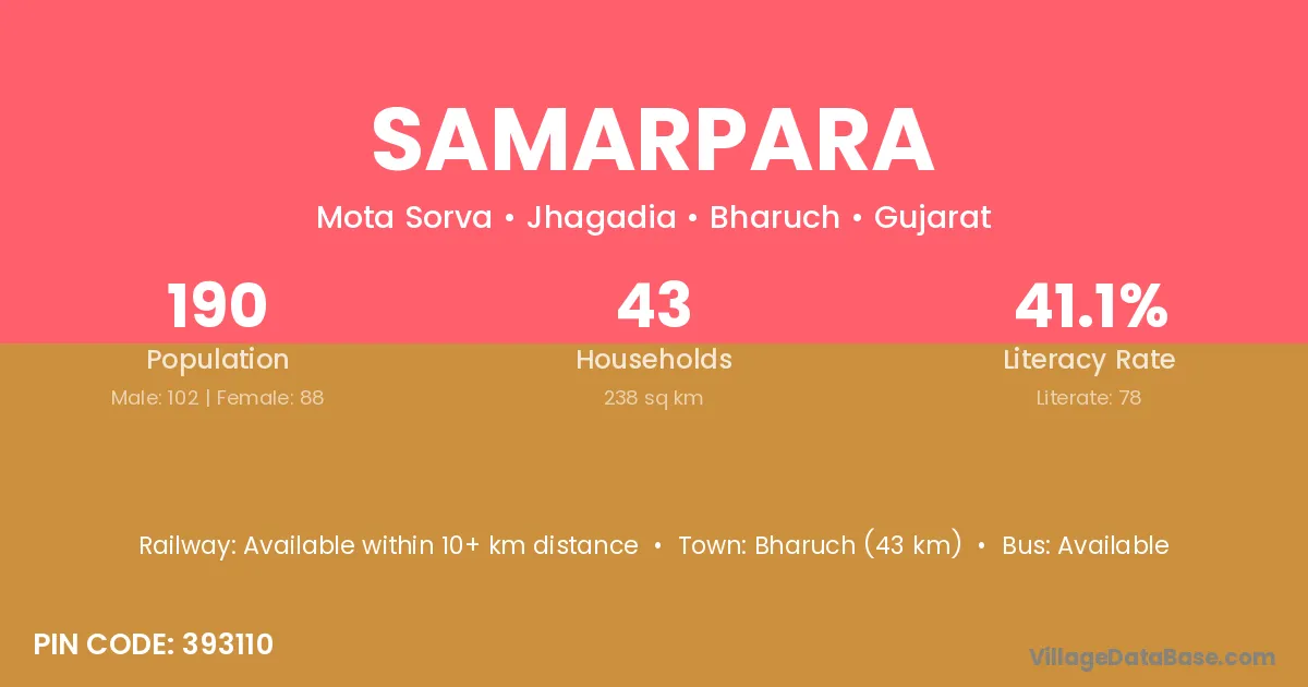 Bharuch (43 km) is the nearest town to Samarpara village for major economic activities and is located approximately 43 km away.