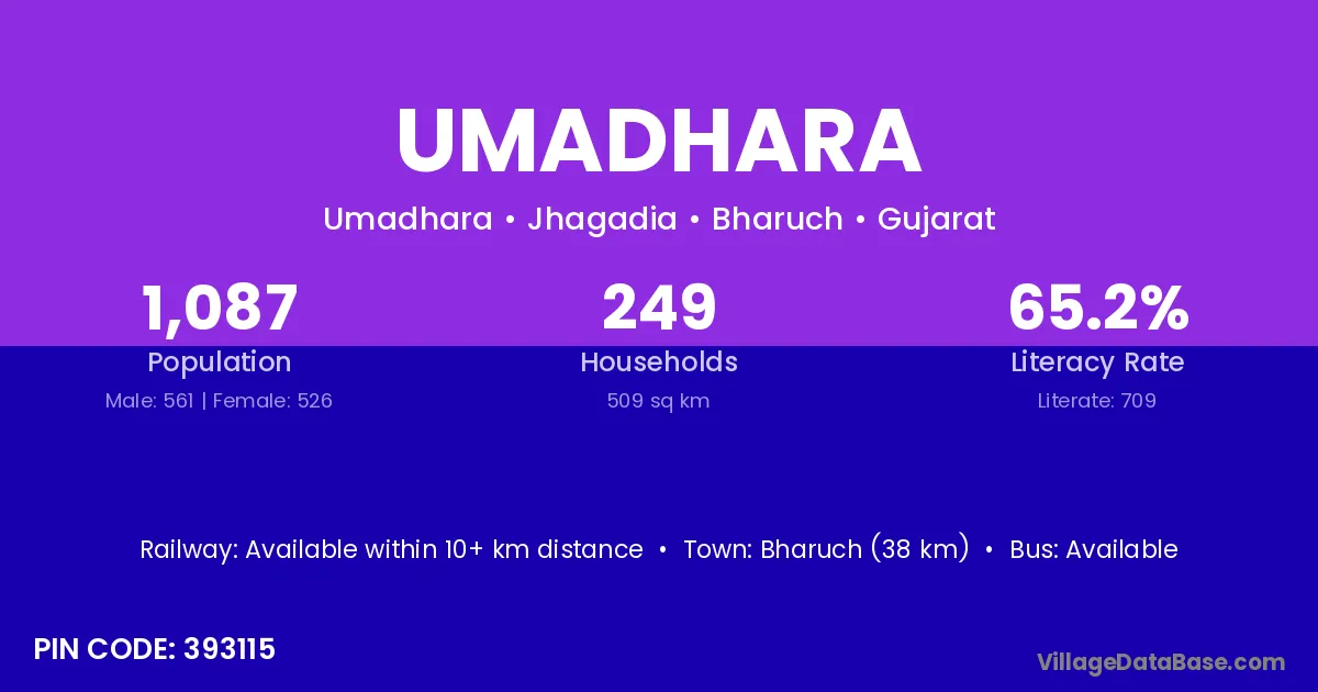 Bharuch (38 km) is the nearest town to Umadhara village for major economic activities and is located approximately 38 km away.