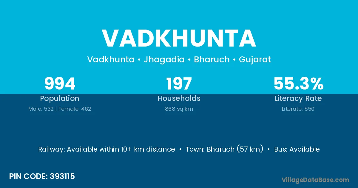 Bharuch (57 km) is the nearest town to Vadkhunta village for major economic activities and is located approximately 57 km away.