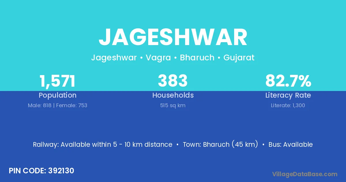 Bharuch (45 km) is the nearest town to Jageshwar village for major economic activities and is located approximately 45 km away.